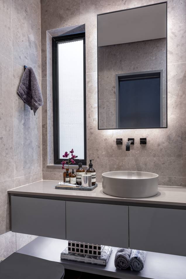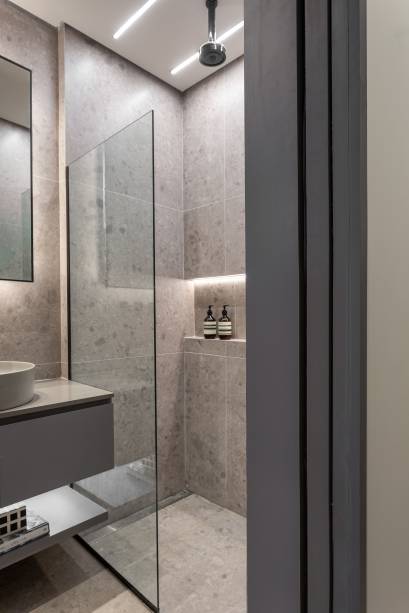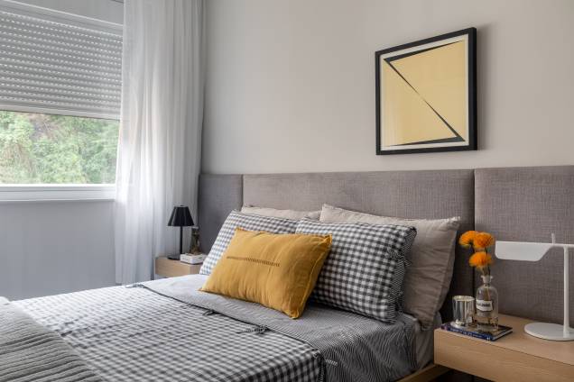 “Usamos cinza claro nas paredes, no piso, na cabeceira da cama e no banheiro. No acabamento da marcenaria, optamos por MDF no padrão Carvalho Malva e Cinza Sagrado, ambos da Duratex”, explica.