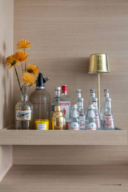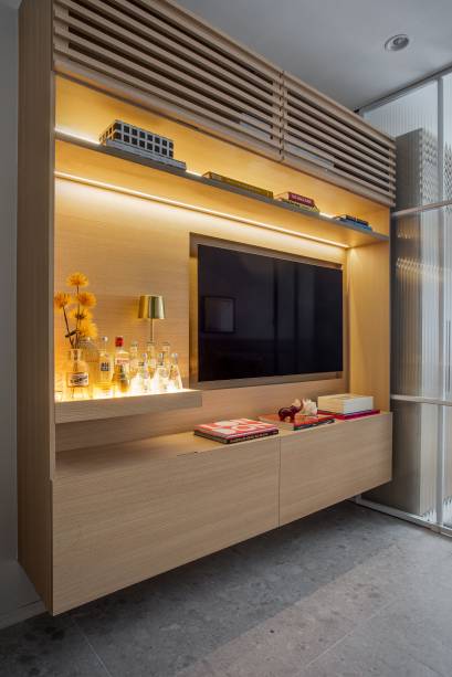 “Ele queria o apartamento mais aberto, uma área para receber amigos, um sofá-cama com design leve e um pequeno bar iluminado”, explica o profissional.
