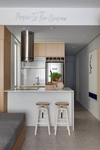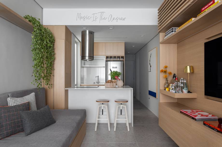 Apê de 32 m² ganha layout novo com cozinha integrada e cantinho de bar