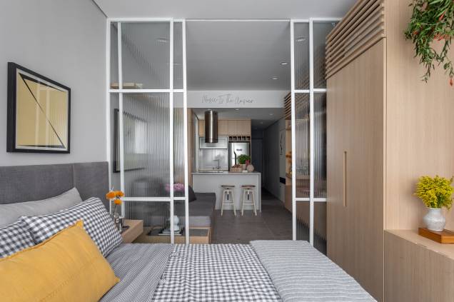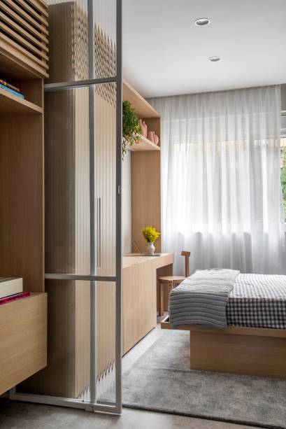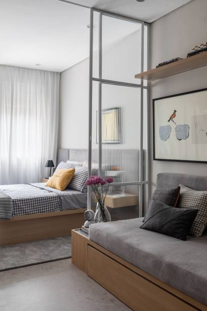 Já a parede que separava o quarto da sala, também foi demolida e, no lugar dela, foi instalado um painel de correr em metalon branco com vidro canelado, que que vai do piso ao teto e permite isolar o ambiente quando necessário, sem bloquear a passagem de luz natural que vem da janela.