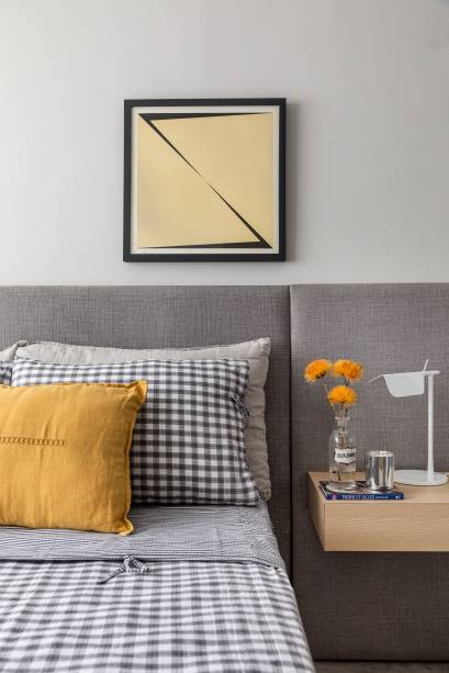 Entre as peças de design assinado, Consoli destaca algumas luminárias: Eclipse (branca, da Artemide) ao lado do sofá, Jardim (dourada, de Jader Almeida) apoiada na prateleira-bar ao lado da tv, Tab (branca, da Flos) no lado esquerdo da cama e La Petite (preta, da Artemide) no lado esquerdo da cama. Próxima à janela, a cadeira Girafa na mesa de trabalho leva a assinatura de Lina Bo Bardi.