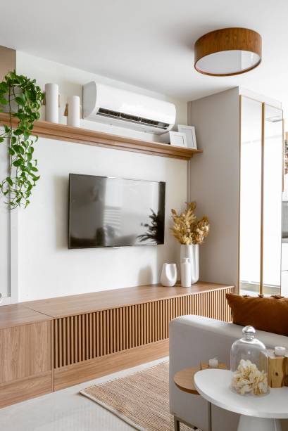 “Aqui, vale destacar também o armário piso teto, com portas em espelho bronze, que projetamos para esconder o pilar entre a sala e a varanda, assumindo ainda a função de cristaleira da casa”, informa Phil. Na seleção dos móveis foram priorizadas peças mais compactas, com medidas proporcionais às dimensões dos cômodos, sem abrir mão da funcionalidade e do conforto necessários.