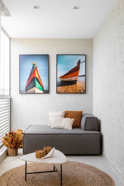 O arquiteto Phil Nunes, da Nop Arquitetura usou uma base cinza e branca com referências praianas nos acessórios, tapetes e materiais naturais.