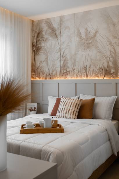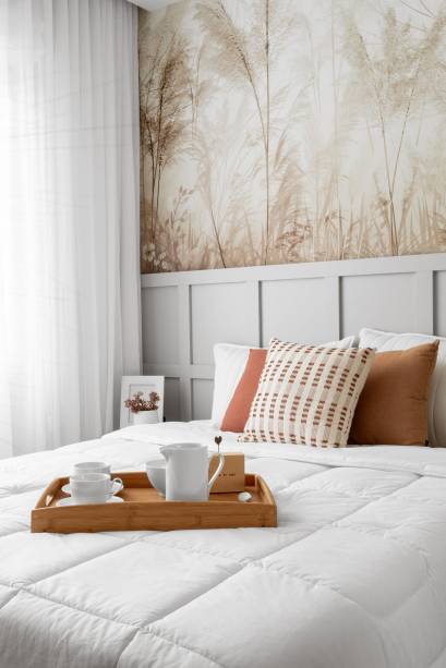 Já a décor do dormitório do casal foi inspirado em quartos de hotel, com destaque para o papel de parede com estampa de vegetação em tonalidade sépia (que acrescentou profundidade e um toque vintage ao espaço) e a cabeceira executada em marcenaria, com molduras que lembram as clássicas boiseries, em versão contemporânea.