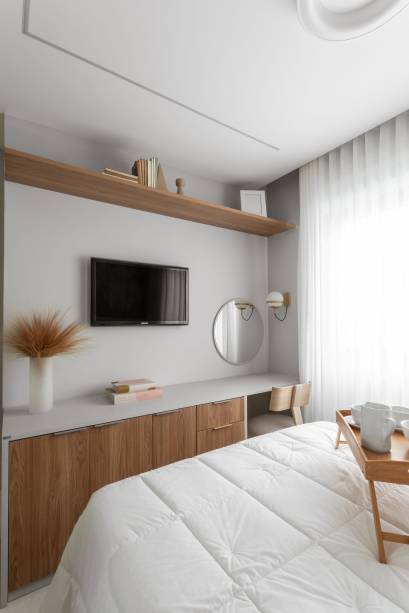 “Deixamos um cantinho livre na extremidade do armário baixo, na frente da cama, que pode ser usado como penteadeira ou bancada de trabalho”, informa o arquiteto.