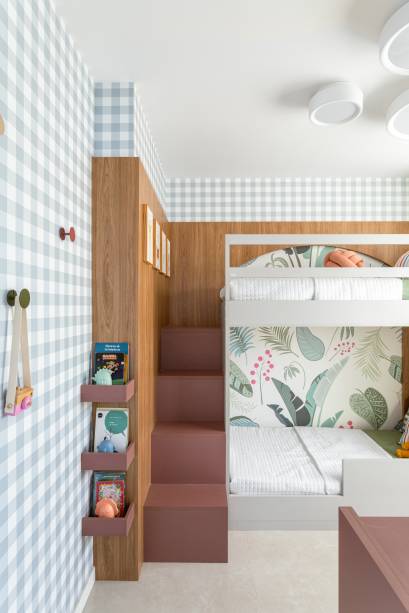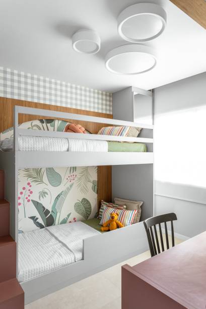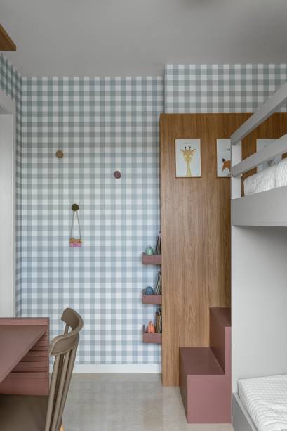 O quarto infantil foi projetado para ser compartilhado entre duas crianças, com decoração lúdica e soluções em marcenaria que separam a área de dormir da área de estudos, sem comprometer a circulação do cômodo. “O mix de papéis de parede com estampa quadriculada e maxi folhas foi uma solução simples, de grande impacto visual e custo mais acessível”, pontua Phil.