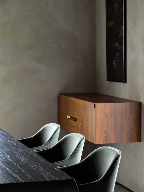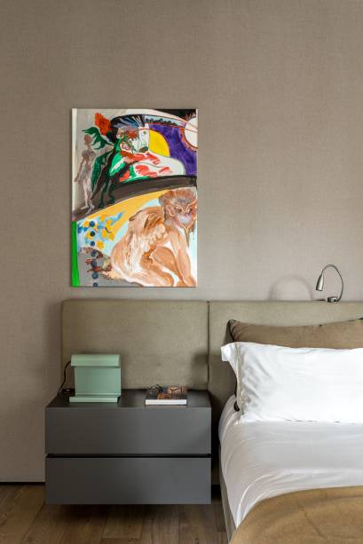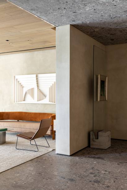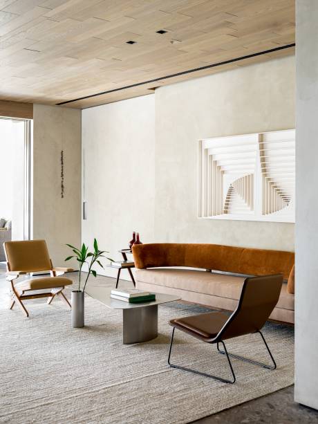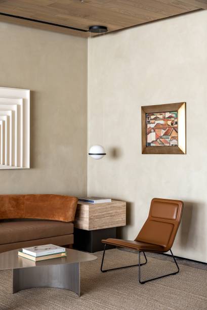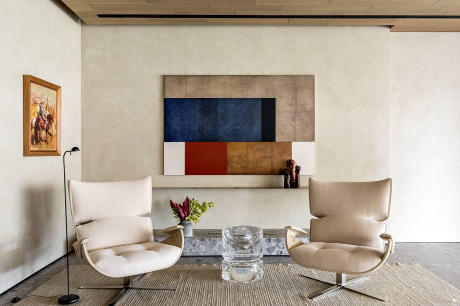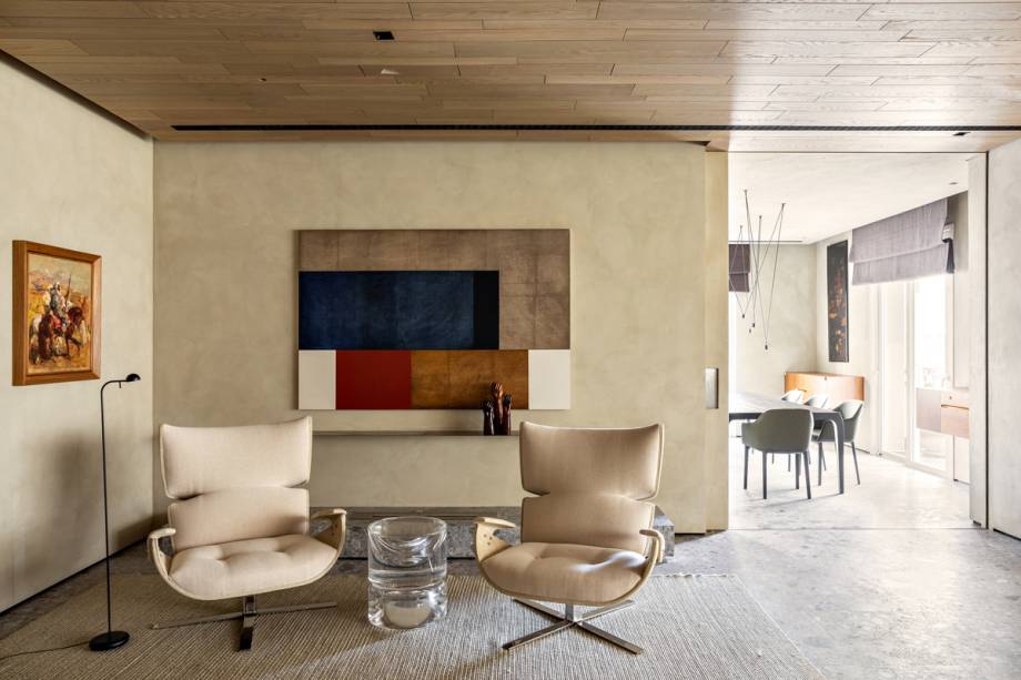 Além disso, em toda a extensão do apartamento, há um delicado forro de madeira de carvalho europeu tingido para dar destaque e aconchego aos moradores.