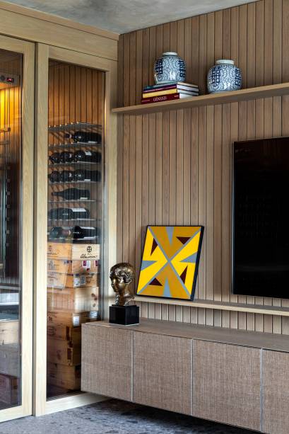 Do outro lado da cozinha fica o home theater integrado à adega do casal, que guarda uma vasta seleção de vinhos adquirida em viagens ao redor do mundo.