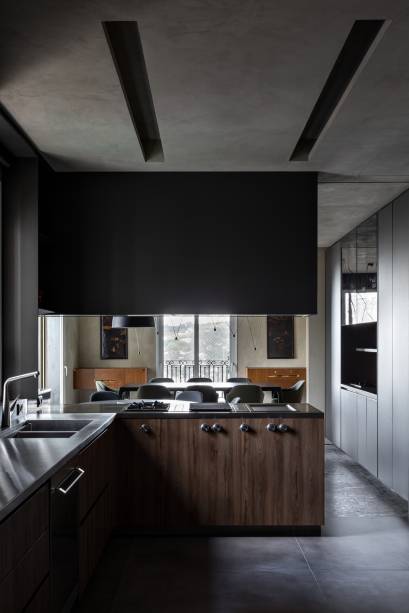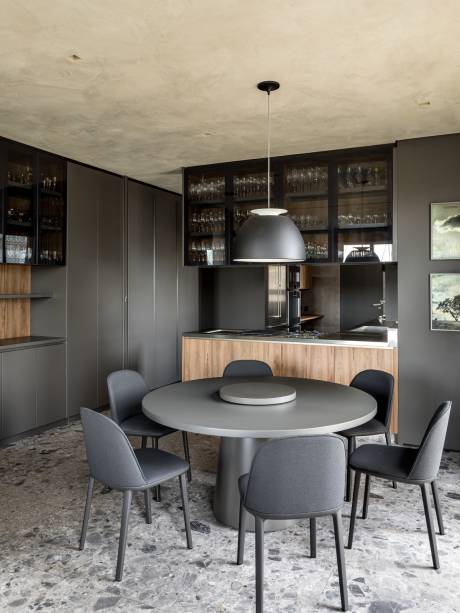 Já a cozinha foi projetada para realizar diversas funções, como tarefas diárias e receber amigos para um eventual jantar gourmet.