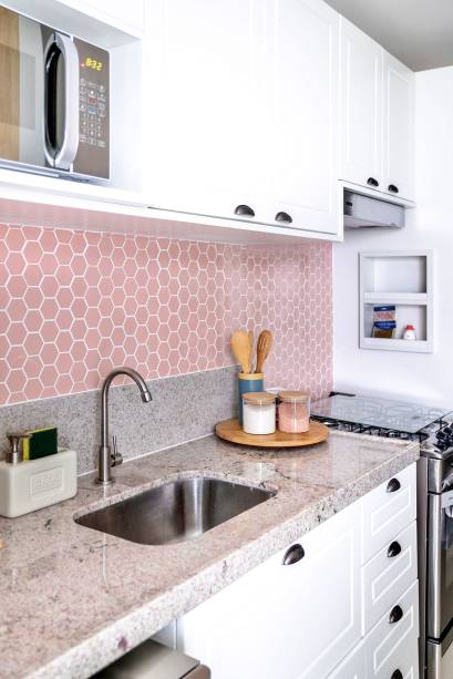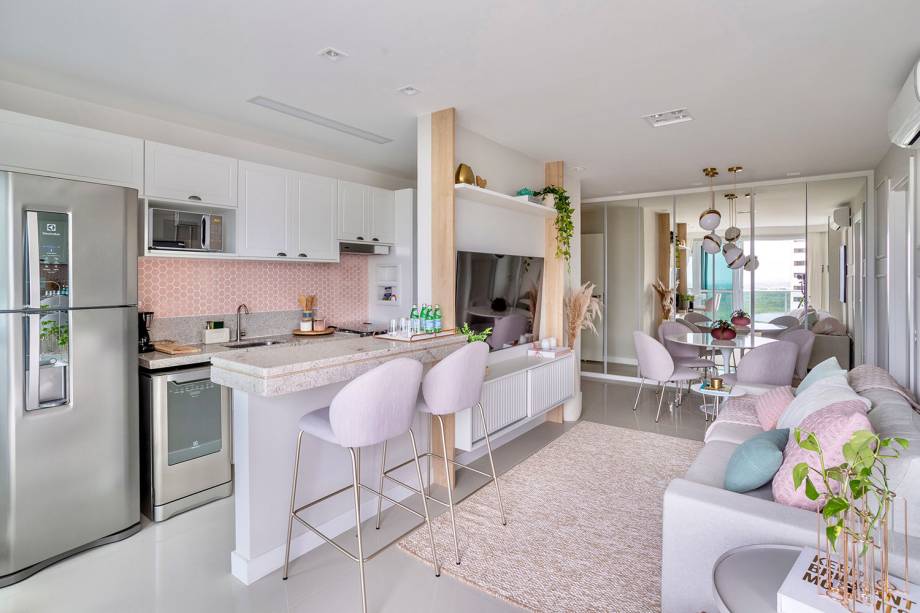 Camila Fleck também destaca outros elementos em seu projeto, como o backsplash de pastilhas hexagonais em tom de rosa claro na bancada da cozinha que já era aberta para a sala; o cantinho de leitura próximo à janela, ambientado com uma poltrona de proporções generosas e design nórdico assinado pela designer Rejane Carvalho Leite.
