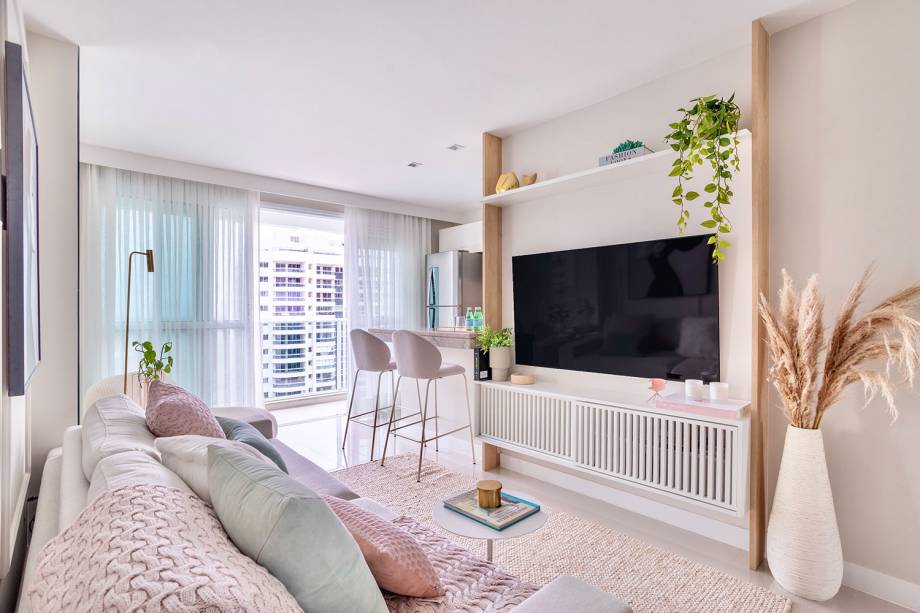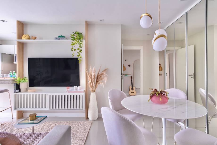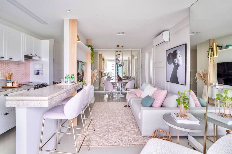 - Apartamento aposta no contemporâneo com branco, cinza e rosa