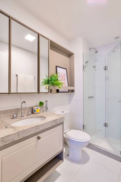 Assinado por Camila Fleck, projeto contemporâneo e feminino tem toques clássicos e décor em tons suaves de cinza, rosa e verde água