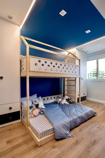 Já no quarto dos meninos, ela usou uma cama pronta com layout personalizado, centralizada entre dois armários de um metro cada. O teto e a parede foram pintados com tinta num tom de azul profundo. Como o rebaixo do teto em gesso já existia, ela especificou led lines contínuos para dar mais bossa ao ambiente.