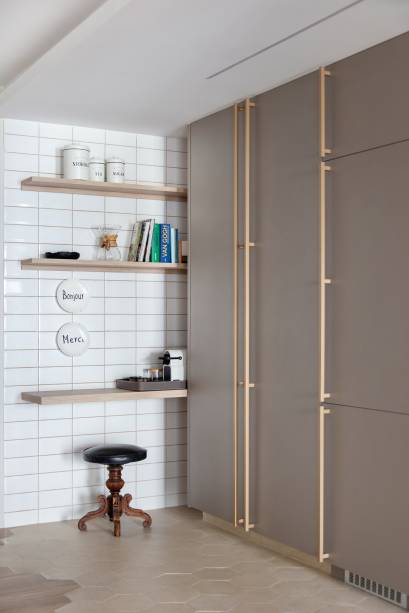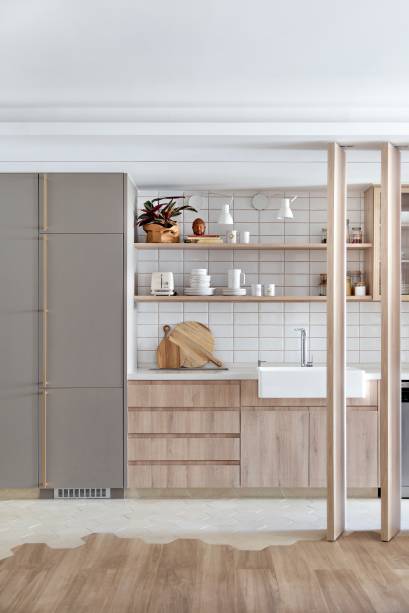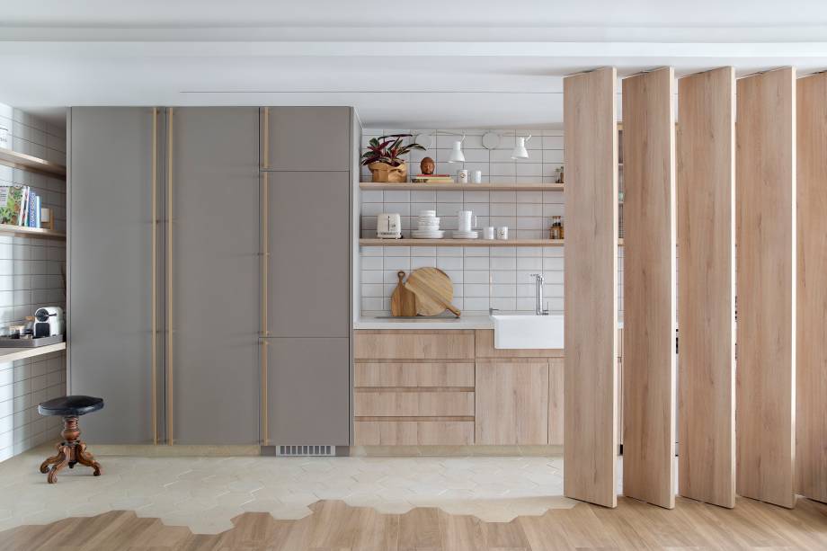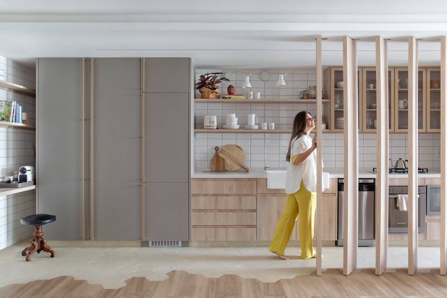 O projeto buscou criar espaços aconchegantes e estilosos, ao mesmo tempo, e adotou uma paleta de cores em tons suaves para deixar o apartamento claro e bem iluminado. A cozinha, por exemplo, tem cuba em estilo farm sink (que remete à fazenda), piso de ladrilho hidráulico com formato sextavado (que se funde com o piso de porcelanato amadeirado do setor social), paredes de cerâmica branca com toque retrô e armários com portas amadeiradas e cinza/fendi, combinadas com portas de vidro canelado.
