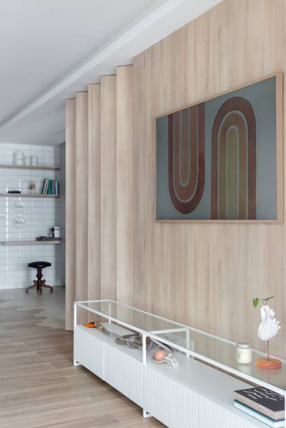 Ainda, brises verticais giratórios (com acabamento em melamina amadeirada) foram instalados entre a sala e a cozinha, não só para oferecer privacidade e controle da luz natural, quando necessário, como também para criar uma conexão visual elegante entre os espaços. Na sala, destacam-se também os painéis de parede de marcenaria, ora em lambri branco ora em melamina amadeirada, alguns móveis de madeira e detalhes em couro natural caramelo.