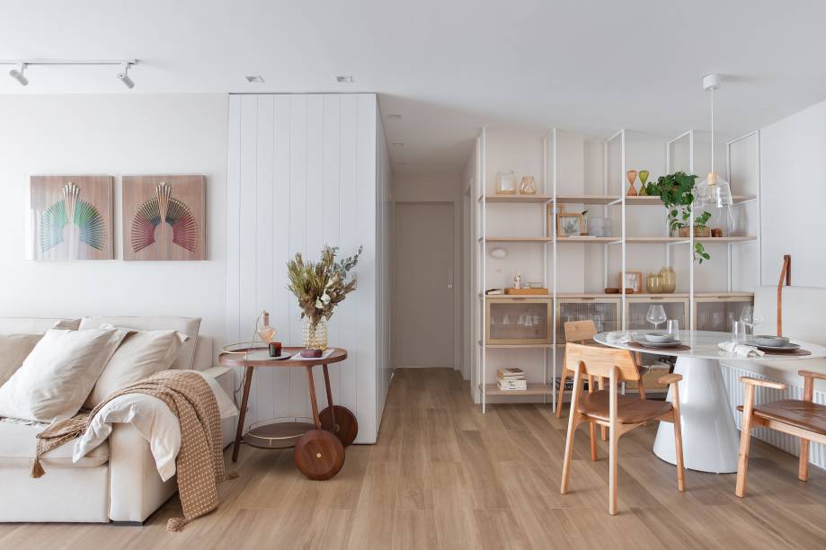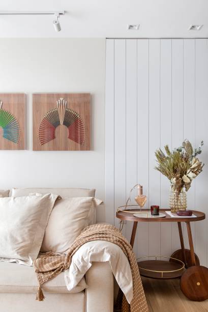 Na decoração, que segue o estilo contemporâneo com pitadas de boho, algumas peças de valor afetivo já faziam parte do acervo dos clientes e foram aproveitados no novo lar, a exemplo do banquinho antigo de madeira (em destaque no canto da cozinha), o vaso de vidro exposto no carrinho-bar, os quadros da sala acima do sofá (cocares indígenas desenhados com lápis de cor) e a escultura Nuvem com Balanço, da designer Nara Ota (fixada na parede da estante da sala. Entre os móveis novos, na área social ela destaca as cadeiras Dera (da Lider Interiores), o carrinho-bar Moon e a estante que vai do piso ao teto.