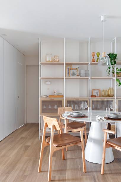 “A estante serve de apoio à mesa de jantar, ao mesmo tempo que funciona como aparador ou buffet. Além disso, sua estrutura vazada de serralheria branca e os módulos de marcenaria fechados com portas de vidro canelado não pesam visualmente no ambiente”, justifica a arquiteta.