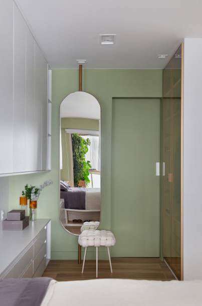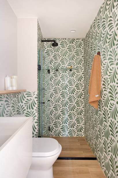 Outros destaques deste cômodo são o espelho giratório alongado ao lado da porta de entrada, fixado no piso e no teto, e o jardim vertical da varanda.