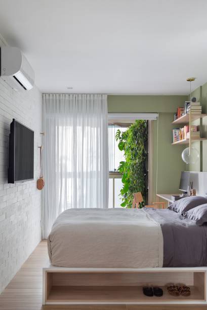 No quarto do casal, a tinta verde aplicada nas principais paredes é uma solução simples e de baixo custo que fez toda a diferença no resultado final. Já a combinação do revestimento em tijolinho claro na parede da tv com a marcenaria branca e a cortina de linho branco ajudou a suavizar a paleta cromática do espaço, ao mesmo tempo que acrescentou diferentes texturas.