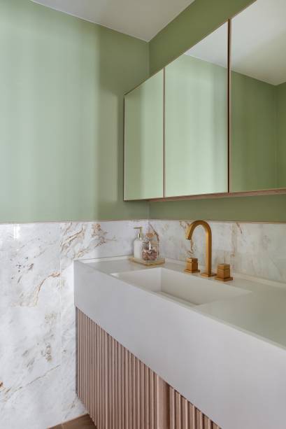 Apê clean de 93 m² tem cuba farm sink, espelho giratório, brises e lambris