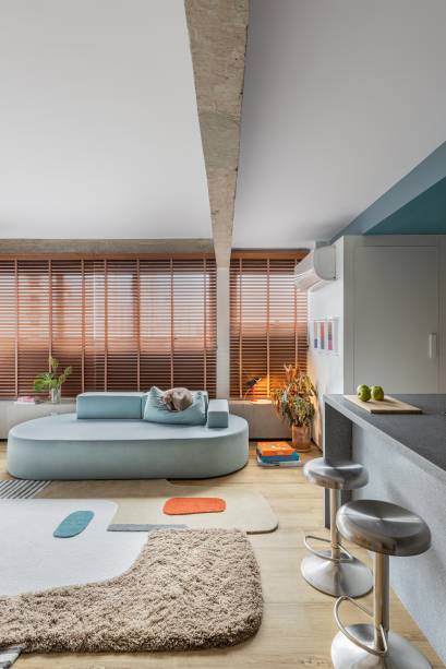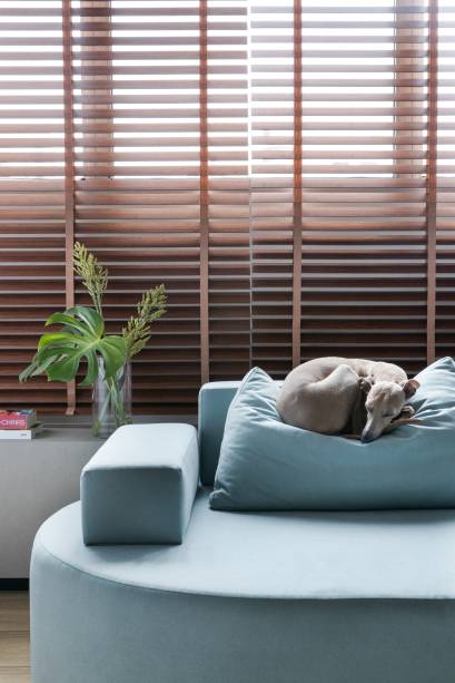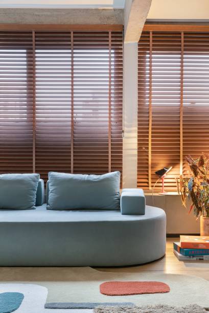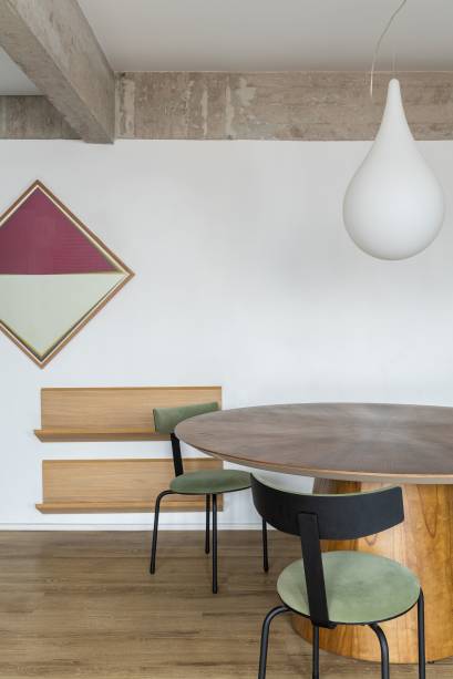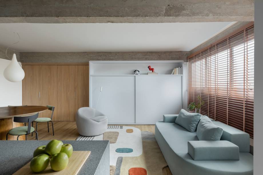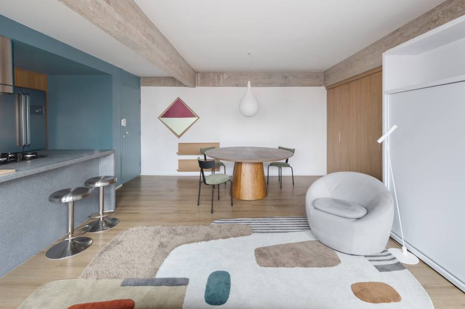 Uma marcenaria inteligente, com duas portas brancas de correr, esconde a cristaleira e a TV, podendo ser aberta ou fechada conforme o uso. Uma porta camarão em freijó, com quatro folhas recuadas, possibilita integrar a área íntima com a social.