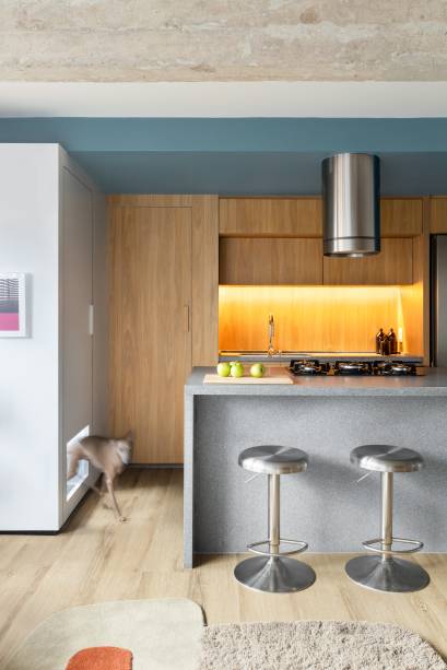 O projeto luminotécnico explora as possibilidades de iluminação indireta, minimizando ao máximo a necessidade de pontos de luz na laje. Nas marcenarias, fitas de LED no teto servem como rebatedores para gerar cenas de iluminação geral. Para a cozinha, uma luz mais funcional sobre as bancadas ajuda nas atividades diárias.