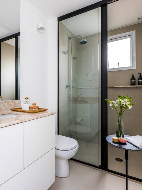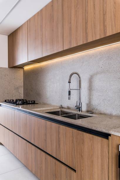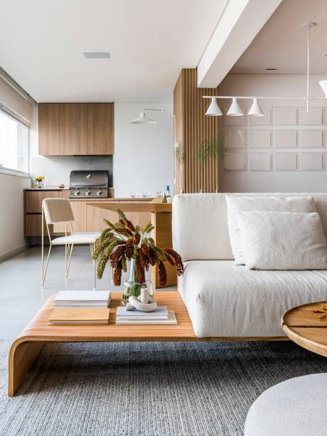 O projeto, assinado por Ticiane Lima, tem materiais de estética minimalista, como o piso de porcelanato no padrão cimento queimado e a madeira clara