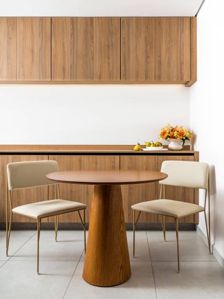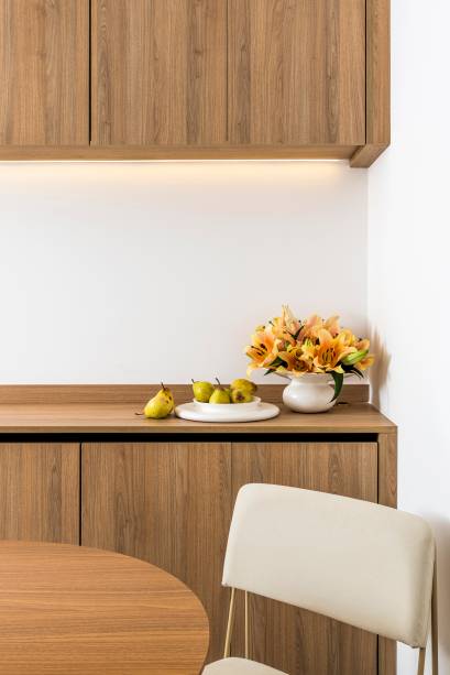 O espaço, conversou muito bem com a parede branca e o painel de madeira que percorre toda a área social, ainda recebeu uma poltrona que deixou o ambiente mais harmonioso e leve.