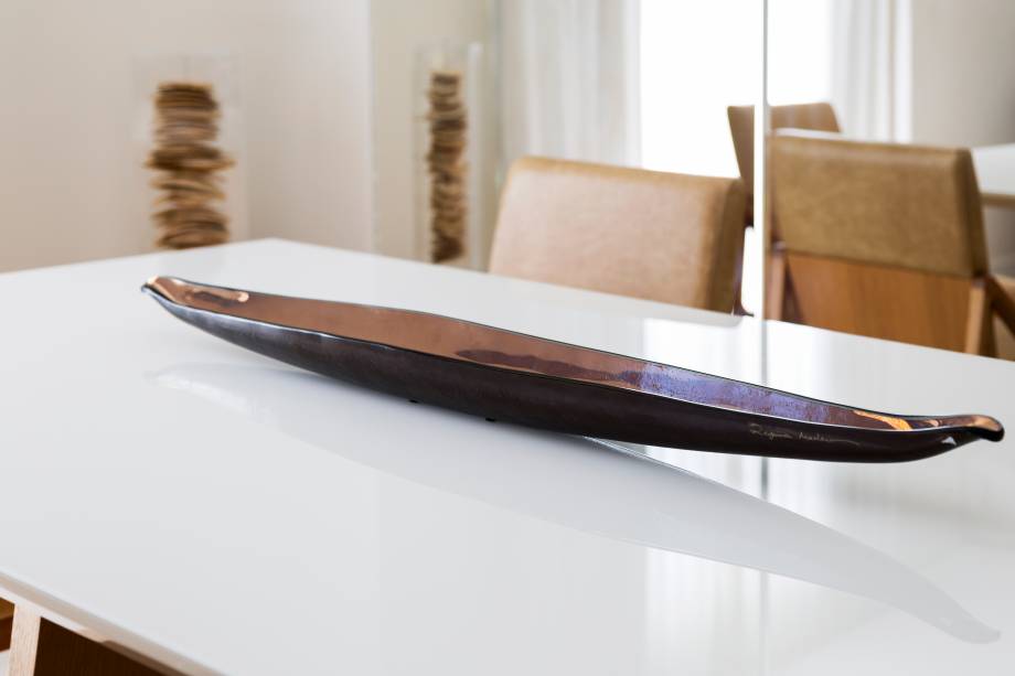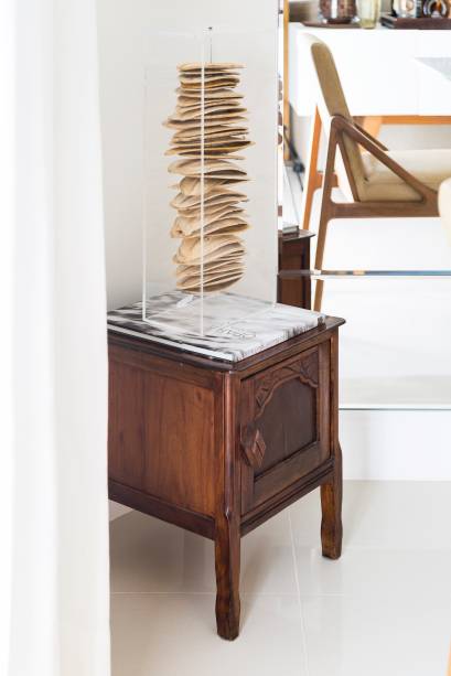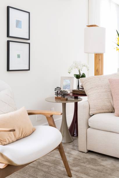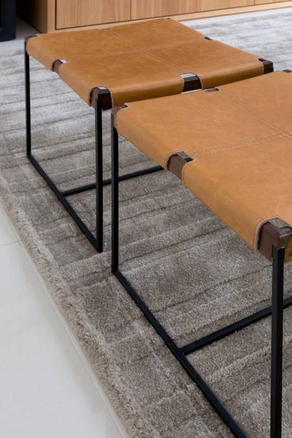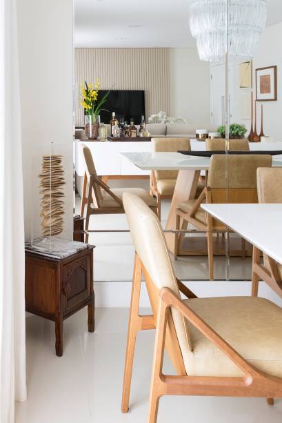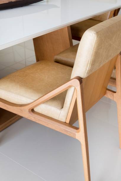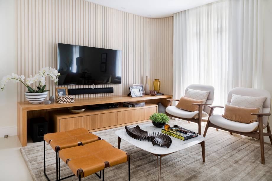 Em contraste foi colocado um móvel baixo em madeira, bem limpo e sem detalhes, priorizando apenas o desenho da folha natural de freijó. Para o mobiliário, Muchon optou por seguir as mesmas cores, mas brincando com texturas de tecidos naturais, além de incluir o couro caramelo, que esquentou o ambiente.