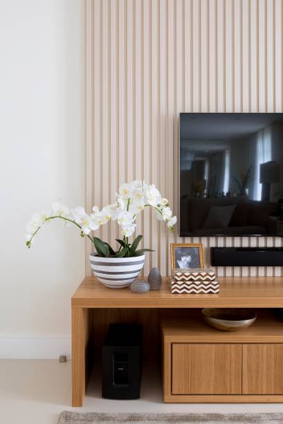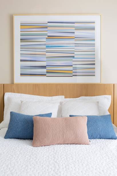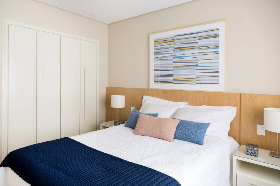 Para manter o diálogo entre os cômodos, no quarto também foi utilizada marcenaria em tom off White, similar ao painel ripado da sala, com cavas esculpidas para trazer mais elegância. O diferencial entre os ambientes foi criado com o enxoval e objetos decorativos.