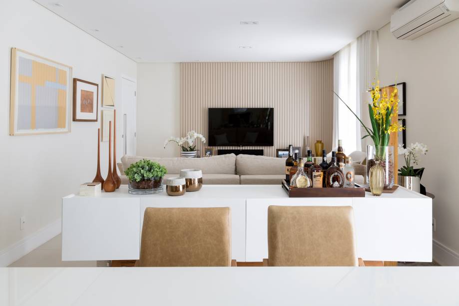 Este projeto é elegante, clean e atemporal. Uma casa que apesar de ser para um casal, foi pensada para abrigar uma futura família. Marcado pelo uso de marcenaria detalhada e feita sob medida para as demandas específicas deles, o apartamento conta com um painel ripado em tom off White na sala com um leve toque de rosé, acompanhando a parede curva existente.