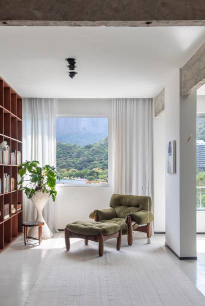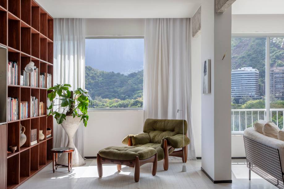 “Mesclamos clássicos do design brasileiro dos anos 1950 e 1960, como a poltrona Jangada e o banquinho, do Jean Gillon, a poltrona Mole e o banco Mocho, do Sergio Rodrigues, o vaso-floreira Spindel, do Willy Guhl, e mesa de centro, do Joaquim Tenreiro, com criações assinadas por designers da safra contemporânea, como Guilherme Wentz, Jacqueline Terpins, Bruno de Carvalho, Felipe Madeira e Jader Almeida”, pontua o arquiteto.