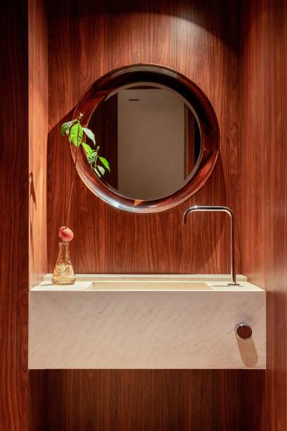“De um lado, o painel mimetiza as duas portas de acesso ao apartamento e os armários da cozinha de uso diário. Do outro lado, vira uma estante-biblioteca, com nicho em aço inox com função de bar”, explica o arquiteto. “Para trazer leveza visual e acrescentar um toque carioca ao projeto, optamos por cortinas em cambraia de linho branco”, acrescenta Fil. Já nos banheiros, os armários em Pau-ferro foram combinados com mármore Travertino Navona, presente no piso, paredes e bancada.