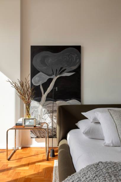 Com as chaves nas mãos, a empolgação tomou conta do casal e o que deveria ter sido uma obra sem grandes demolições acabou resultando em uma reforma completa, especialmente na área social e cozinha. “Os quartos sofreram pouca intervenção porque queríamos manter algumas características originais do edifício modernista, construído nos anos 1960, como o piso em taco de peroba-do-campo, os guarda-roupas em madeira com molduras e as sancas de gesso”, revela Fil.
