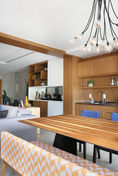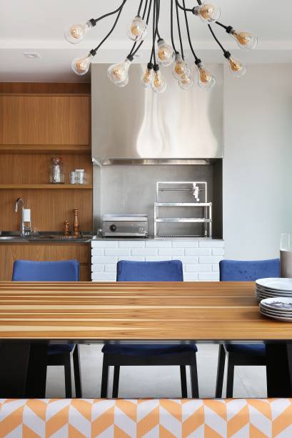 Os moradores apreciam elementos diferenciados, por isso, foi escolhido um pendente de filamento único sobre a mesa de demolição, combinado a cadeiras azuis e um banco amarelo. A área da churrasqueira recebeu um cantinho especial em MDF amadeirado, com armários integrados aos outros espaços.