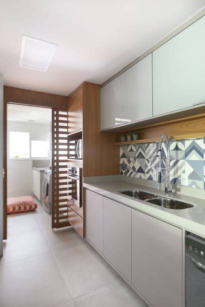 O projeto, assinado pelo escritório RMV Interiores ainda possui uma cozinha ampla com ilha e um pequeno cantinho pet na lavanderia.
