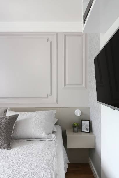 Ao contrário da parte social, a suíte master foi planejada em tons neutros de cinza e branco, criando um ambiente acolhedor e sofisticado. A parede atrás da cama recebeu boiseries e uma cabeceira no mesmo tom da pintura. A janela foi decorada com papel de parede estilo provençal, complementado por um cortineiro discreto.
