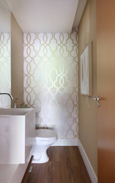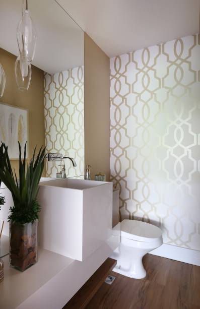 O lavabo se destaca com toques de dourado no papel de parede, combinando com a pintura da parede da bancada. A bancada, uma prateleira em mármore com uma cuba vertical esculpida, adiciona sofisticação e exclusividade ao ambiente.