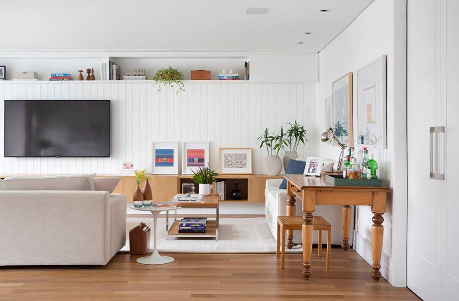A decoração do apartamento como um todo segue um estilo contemporâneo atemporal, pontuado por móveis antigos que contam histórias e conversam bem com os novos. Segundo a arquiteta, muitas peças foram reaproveitadas do antigo endereço da família, no Rio.
