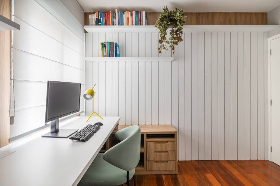 Já o escritório foi concebido para ser um espaço funcional para duas pessoas, com prateleiras abundantes para livros e um painel ripado branco, que mantém o ambiente organizado e clean, propício para o dia a dia de trabalho.