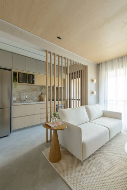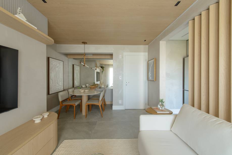 Apê de 56 m² em tons de bege tem divisória articulada entre sala e cozinha