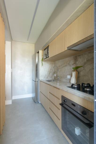 Pensando nisso, a varanda foi preservada, criando um espaço exclusivo para o pet da família, e uma divisória articulada foi colocada para a cozinha. Essa divisória pode ser aberta ou fechada, garantindo transparência visual a área da cozinha, e ampliando o espaço social do apartamento.