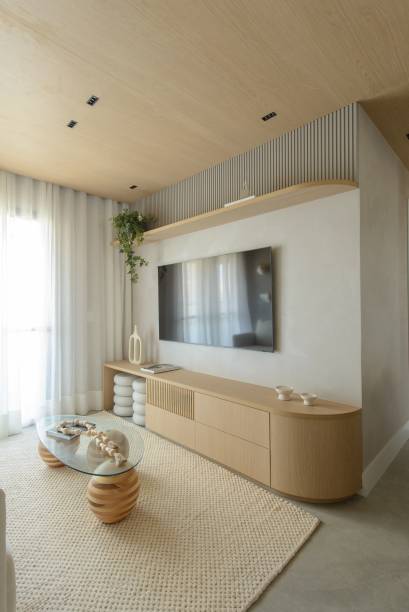 A sala de jantar, recebeu uma mesa orgânica, apoiada sobre um buffet, e um grande espelho ao fundo ampliou visualmente o espaço, dando uma atmosfera convidativa e elegante. Detalhes de iluminação também foram cuidadosamente planejados, como o pendente luminária LINK, assinado pelo Studio Gabriel Dornelas, e as cadeiras “ Anna”, de Jader Almeida. Já a sala de TV ganhou a mesa de centro Bolas, de Green I Zefe.