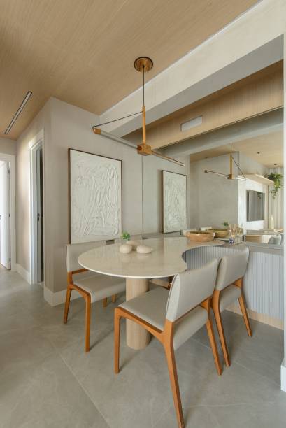 O projeto do escritório Ana Carolina Queiroz Arquitetura também incorporou uma mesa em formato orgânico na sala de jantar.