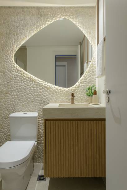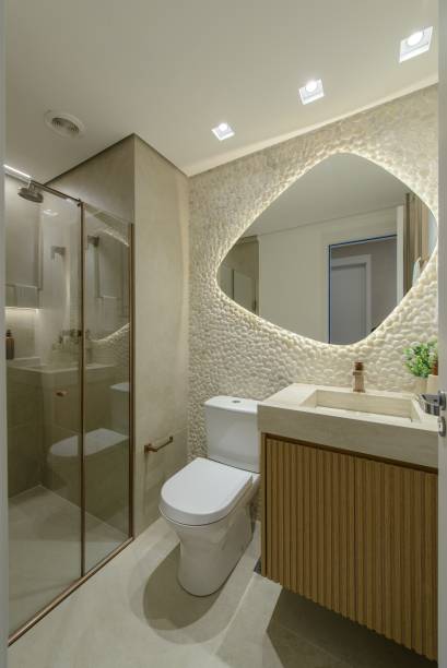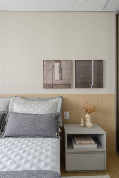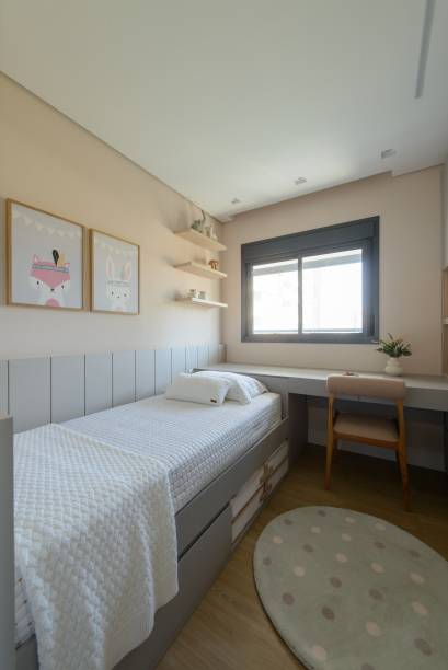 Os quartos receberam piso vinílico para maior conforto. O quarto da filha ganhou a “Cadeira Sushi”, assinado pela designer Linda Martins. No banheiro e lavabo, o uso de Seixo Rolado da Palimanan adicionou textura e personalidade. E o banheiro também recebeu suportes de toalhas desenhados com serralheria artística, que adicionam sofisticação ao ambiente.