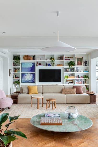 “Além de bastante amplo, o apartamento tem o pé-direito alto e uma varanda frontal generosa, com mais de 50 m², que se comunica com o setor social em toda a sua extensão, garantindo luz natural farta dentro de casa”, conta Carolina. A obra foi iniciada em 2023, assim que o casal se instalou com os filhos no apartamento do andar de cima, que, por sorte, estava vago, disponível para aluguel.