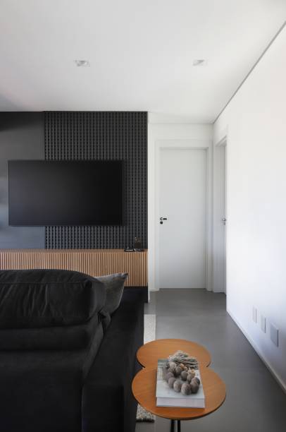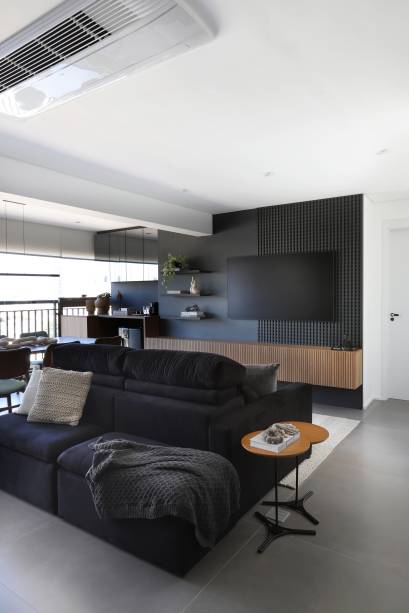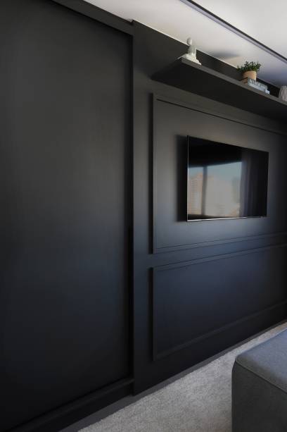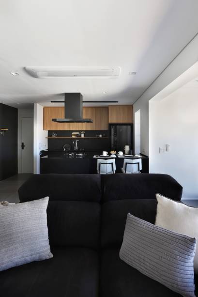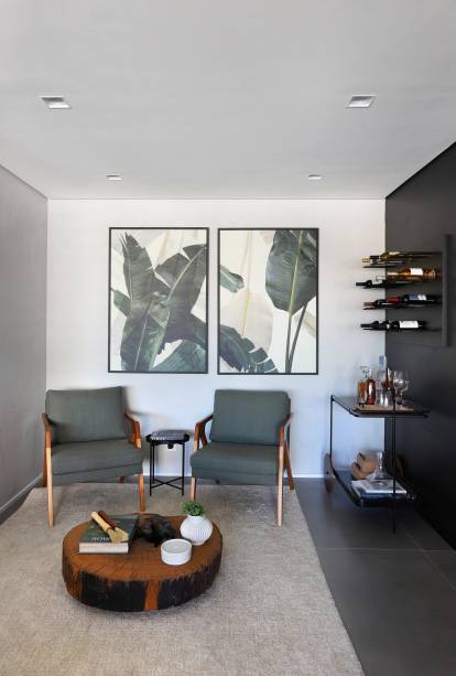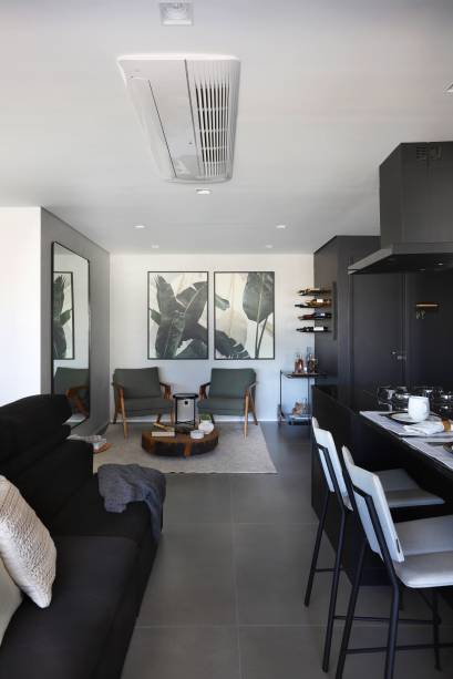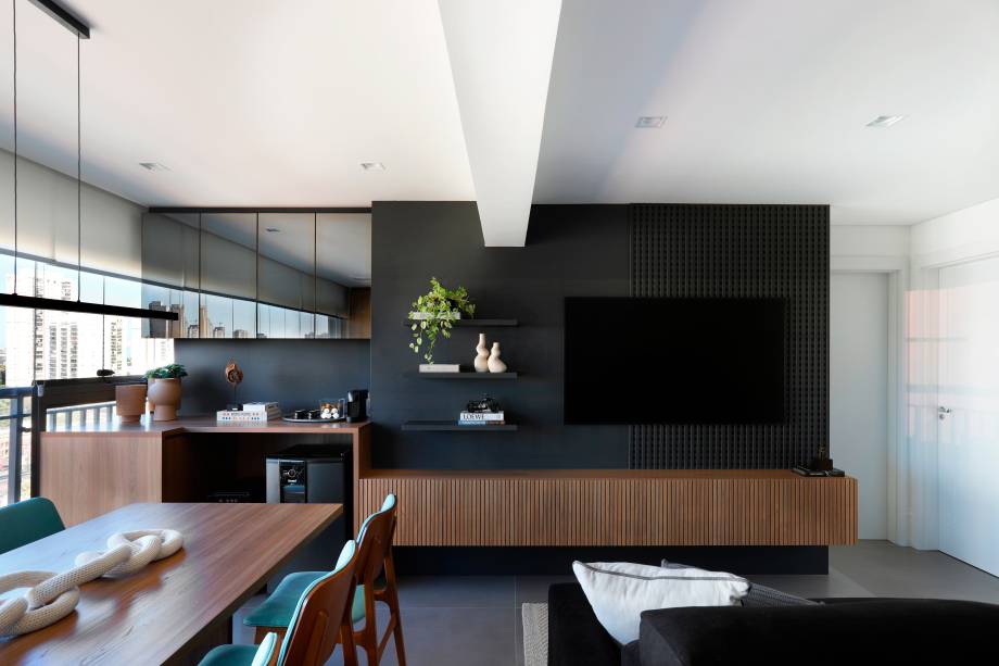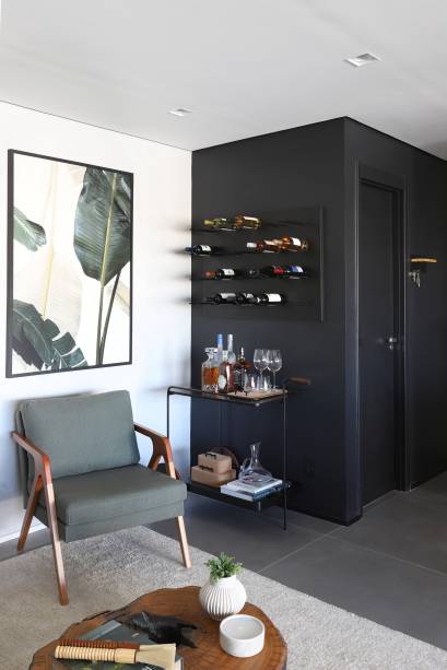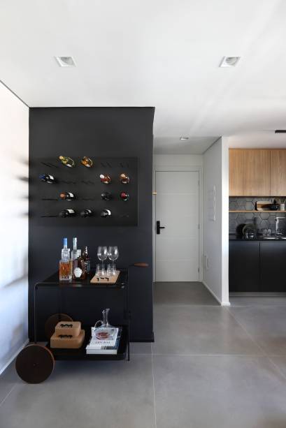Apê em tons de preto de 91 m² tem cantinho de degustação de vinho