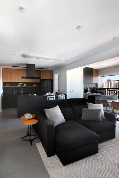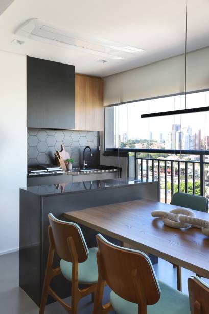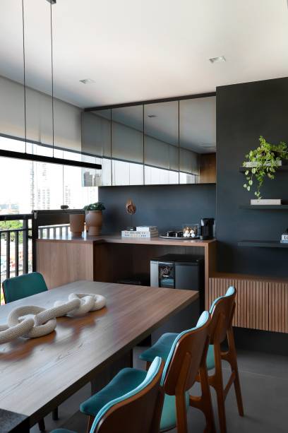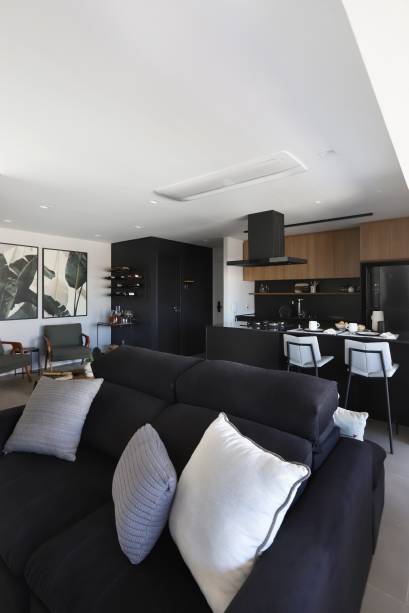 Para criar um apartamento com um layout plural que incluísse diversos ambientes em um só, os arquitetos integraram o terraço gourmet, com uma espaçosa mesa de jantar com seis cadeiras ao living e criaram uma bancada na cozinha que unificou os ambientes. Projetaram o painel da TV em uma parede estratégica, para que se pudesse assistir confortavelmente à TV de todos os ambientes integrados (sala, varanda gourmet, cozinha e espaço wine).
