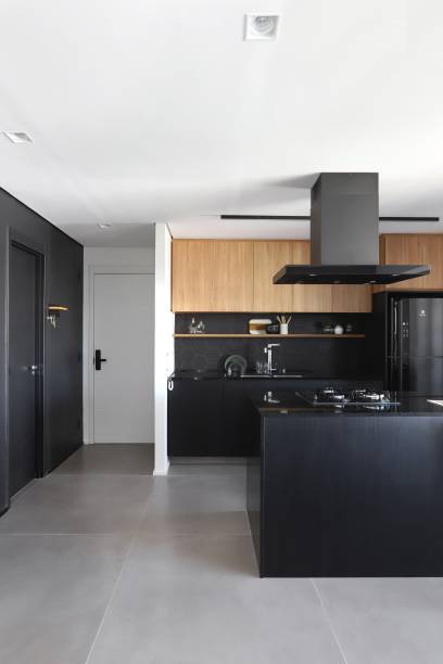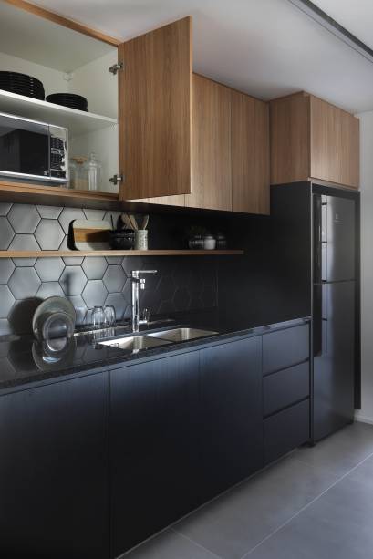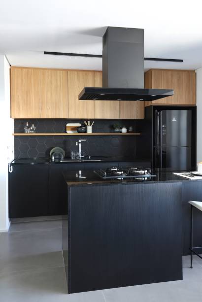 A cor preta prevaleceu em todos os ambientes; na marcenaria (MDF Nero), no mobiliário, nos objetos de decoração, nas bancadas, nos revestimentos hexagonais, colorblock do lavabo, nas portas, metais e eletros. Para quebrar a monotonia desta cor e suas nuances para os cinzas, a Fantato Nitoli Arquitetura compôs uma atmosfera harmônica com diferentes materiais, texturas e acabamentos, para que se evitasse ficar um ambiente muito escuro e pesado.