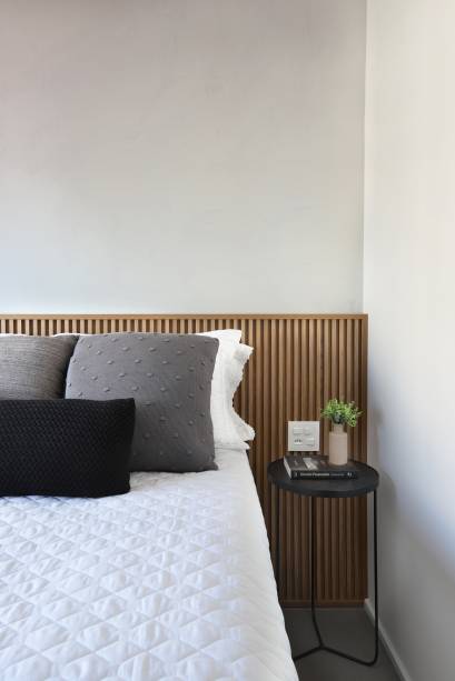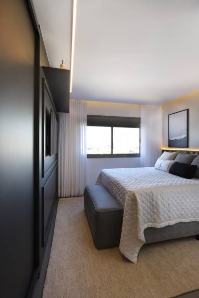 Na suíte, a cabeceira ripada desenhada pelo escritório de arquitetura traz a leveza do MDF em madeira clara em contraste com as portas dos armários e painel da TV em MDF Nero, seguindo a mesma linguagem de cor do restante do apartamento.